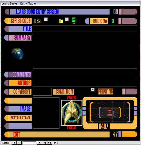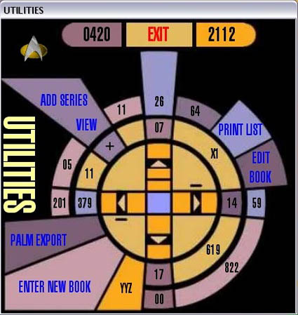 Witness the result. Utilizing MS-Access, I've developed a system that has the true LCARS feel, with animated graphics, expandable and customizeable features and limitless storage capabilities. Now I'm offering the database structure for sale. Don't worry - it won't include my list of books (which you can see on this site).